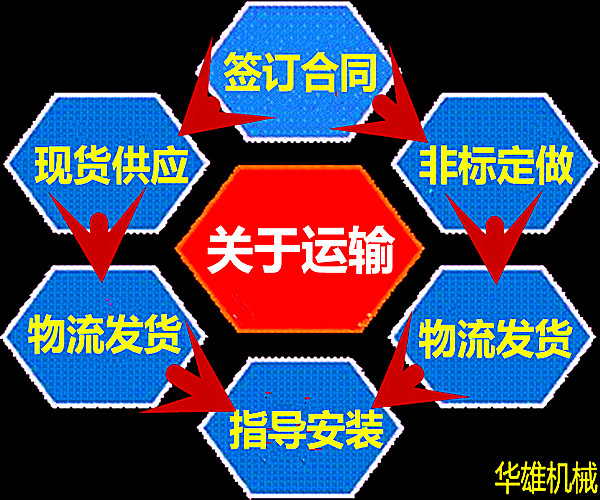 華雄機械對于常規產品現貨供應,當天訂貨,當天發貨,購買便捷。我公司按照合同規定的時間、地點,把貨物運輸到目的地。貨物托運后,我公司按照物流變更隨時通知收貨人。對于非標定制,我公司在預定工期內完工之后及時通知客戶,如客戶有指定物流或快遞,我們會按照客戶要求發貨,如果客戶無特殊制定物流或快遞,我公司默認德邦物流發貨。